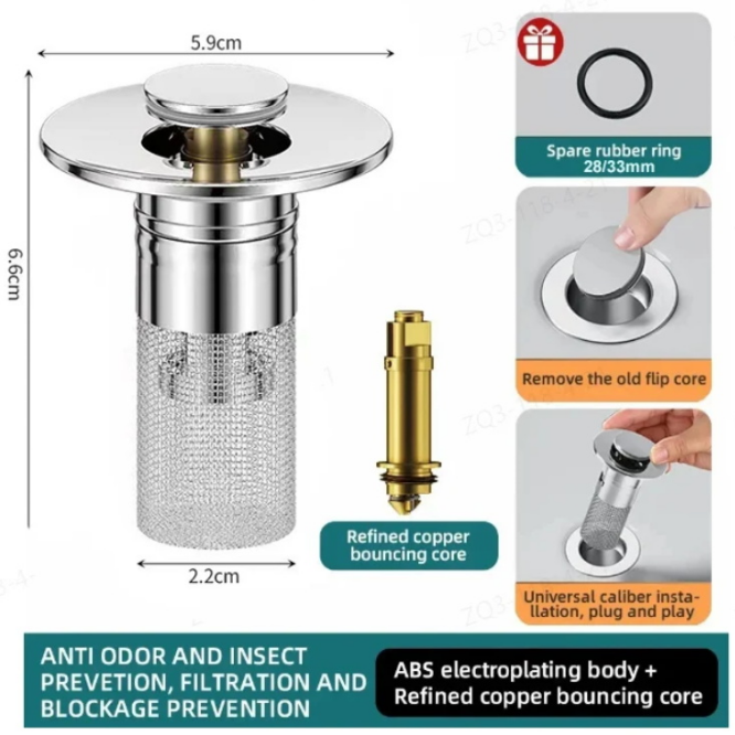 ΕΥΚΟΛΗ ΕΓΚΑΤΑΣΤΑΣΗ - Οποιοσδήποτε μπορεί να εγκαταστήσει το αναδυόμενο φίλτρο αποστράγγισης, καθώς έχει απλή δομή και δεν χρειάζεται εργαλεία. Απλά αφαιρέστε το παλιό πώμα αποστράγγισης νιπτήρα και τοποθετήστε τον αναπηδούντα πυρήνα.