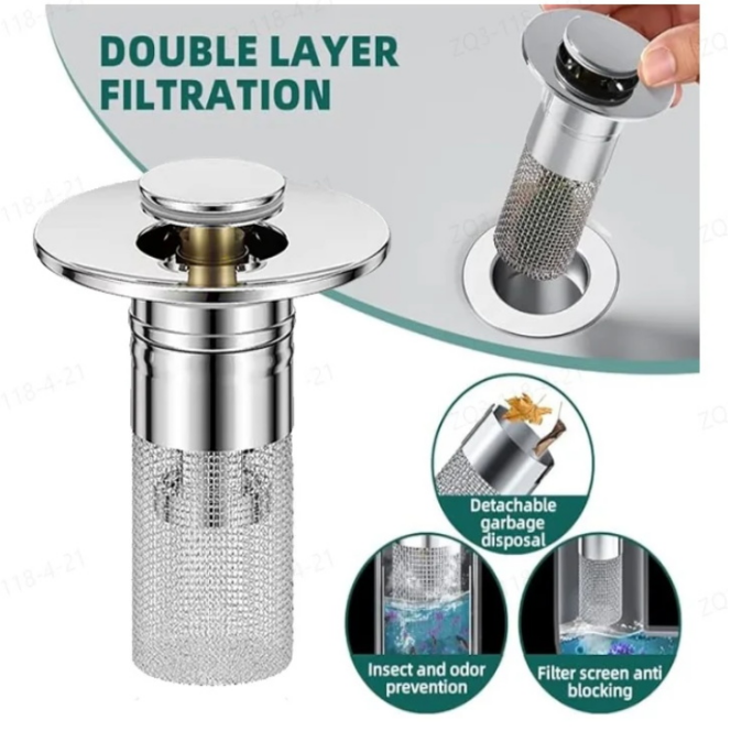 Σε αντίθεση με τα συνηθισμένα πώματα αποστράγγισης με κουμπί, αυτό το πώμα αποστράγγισης διαθέτει ένα φίλτρο-καλάθι κατά της απόφραξης στο εσωτερικό του, το οποίο συλλέγει τα μαλλιά και αποτρέπει την απόφραξη της αποστράγγισης. Κανένα κόσμημα, δαχτυλίδι, βρωμιά ή άλλο αντικείμενο δεν θα εισέλθει στον σωλήνα αποστράγγισης.